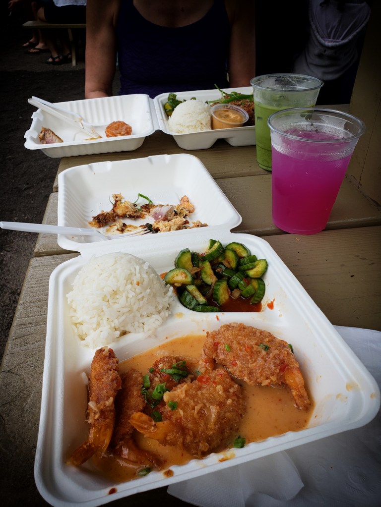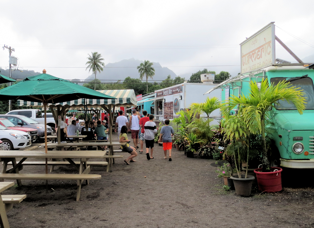 We had some great meals in Hanalei. There are food trucks on the right as you enter town. Christmas Eve day Karen and I had one of our best meals here. For lunch, I had the best coconut shrimp I ever had and Karen had a tuna bomb which was great.