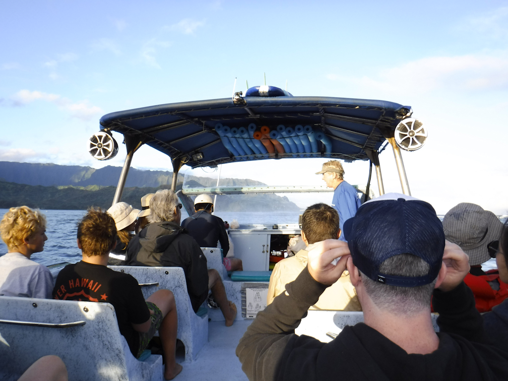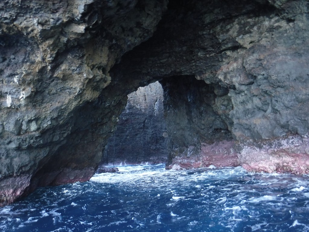 From their shop it was a short walk to the beach where we met the boat. The boat motored up the Na Poli coast. We saw waterfalls, the boat brought us into to a cave where a video had been shot. I don’t remember which artist, I must have never seen video but the cave was beautiful.