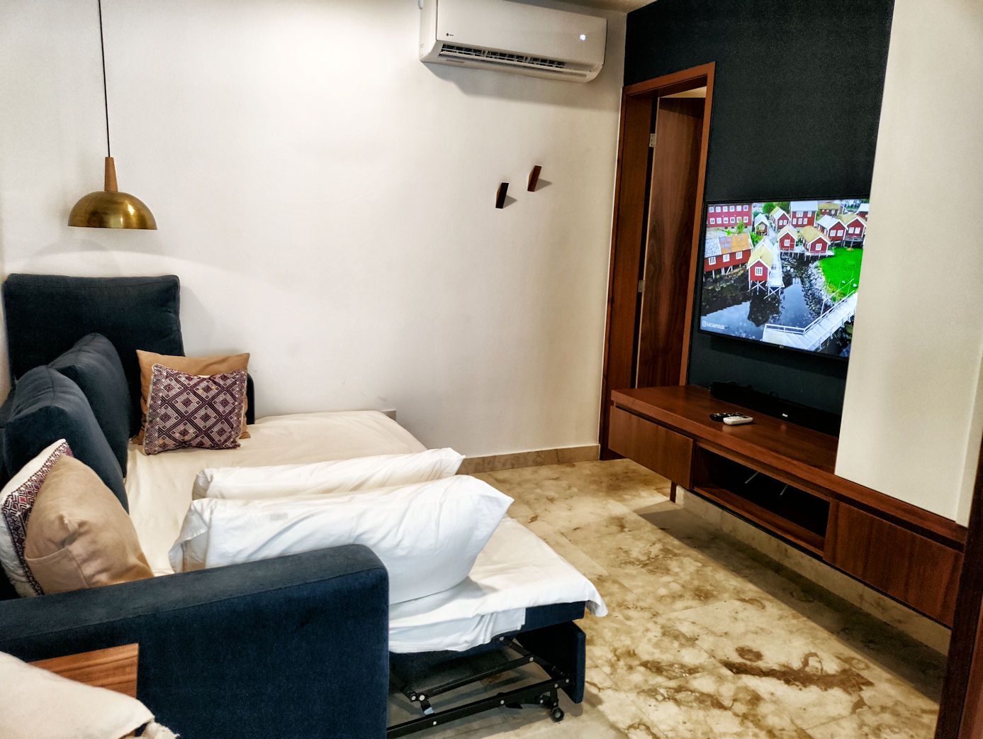 The agent brought me to the room. It had a large kitchen, a balcony with no chairs but no bedroom. When I booked the room on Booking.com I thought I was booking the entire condo. I booked the living room and kitchen. My bed was a sleeper sofa. This wasn’t going to work for two weeks. Booking.com agreed to cancel my room.