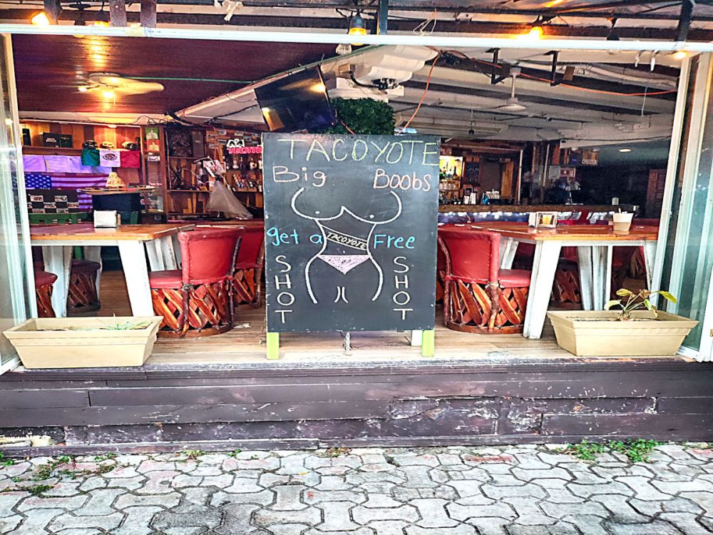 There are many businesses with signs that say Big Boobs get a free shot